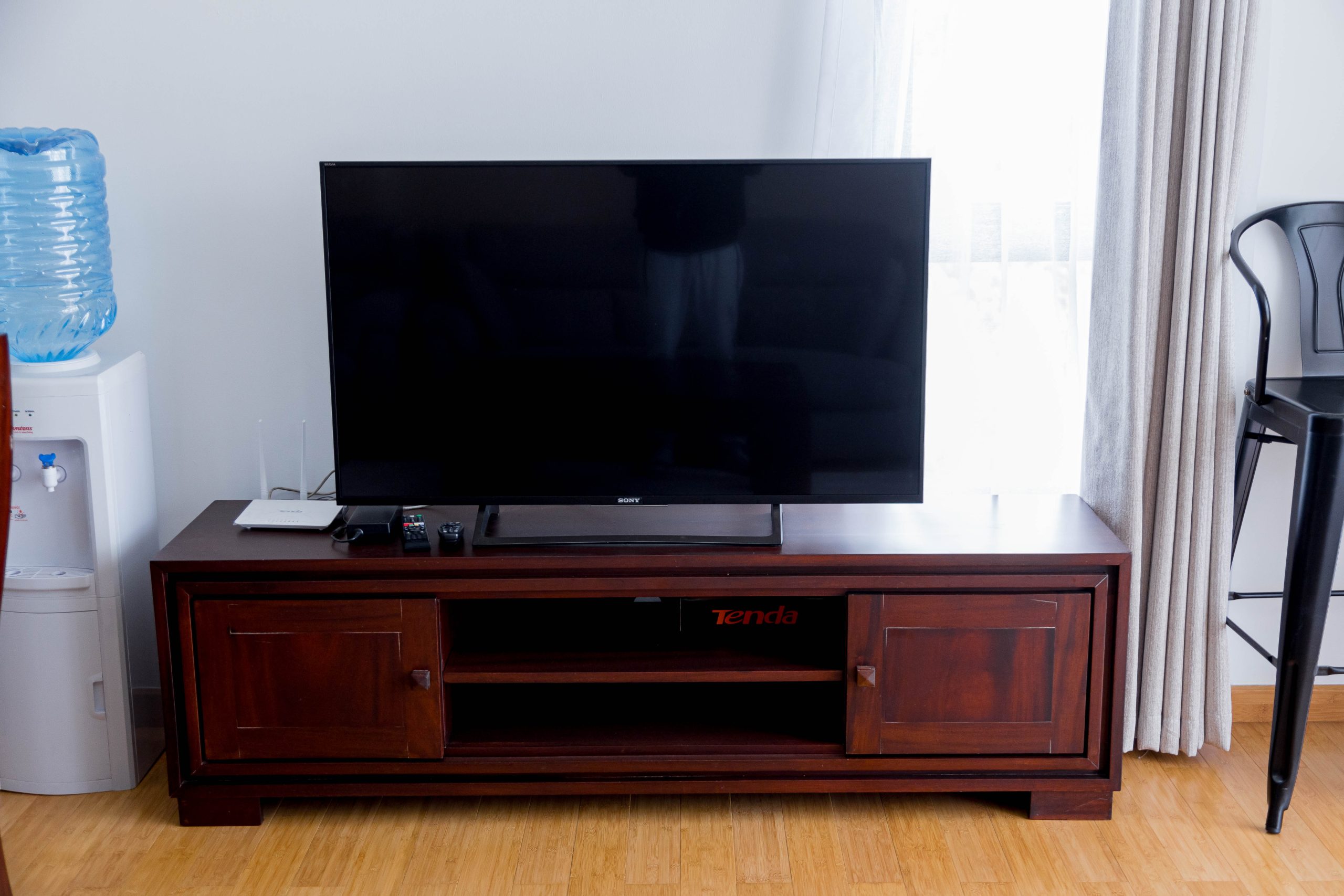 Full living room setup (TV, Wi-Fi, couch, dining area)
